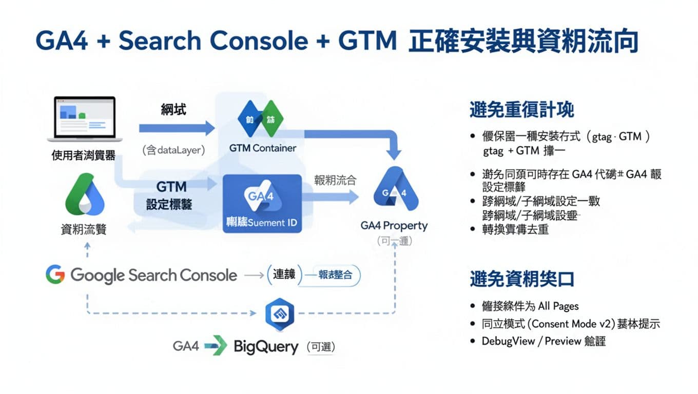 我們在協助中小企業做 GA4 GTM 安裝 時,最常遇到兩種痛點,一是重複計數,二是資料缺口。這篇會用實務角度,把 GA4、Search Console、GTM 的正確做法一次講清楚,讓團隊少踩坑,降低技術門檻,也更快把數據用在營運上。